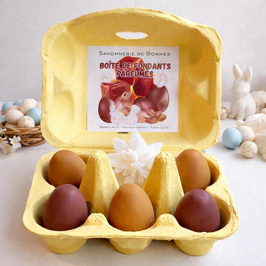 Une jolie boîte à œufs réutilisable contenant des fondants de cire œufs au chocolat caramel et une fleur blanche coton.