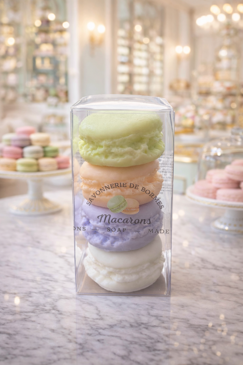 Boîte avec couvercle transparent de 4 SAVONS MACARONS ASSORTIS verveine, orangeraie, musc, lavande