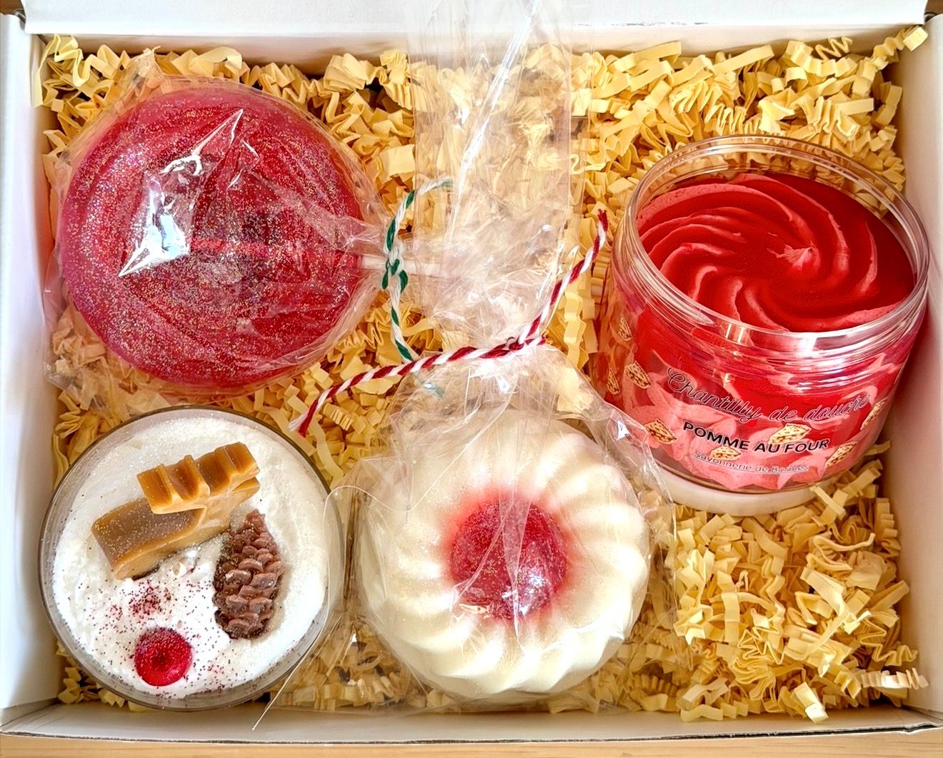 Il contient ; un savon sucette pomme d’amour , 1 gelato chantilly de douche pomme au four , 1 mini bougie et un gâteau savon.