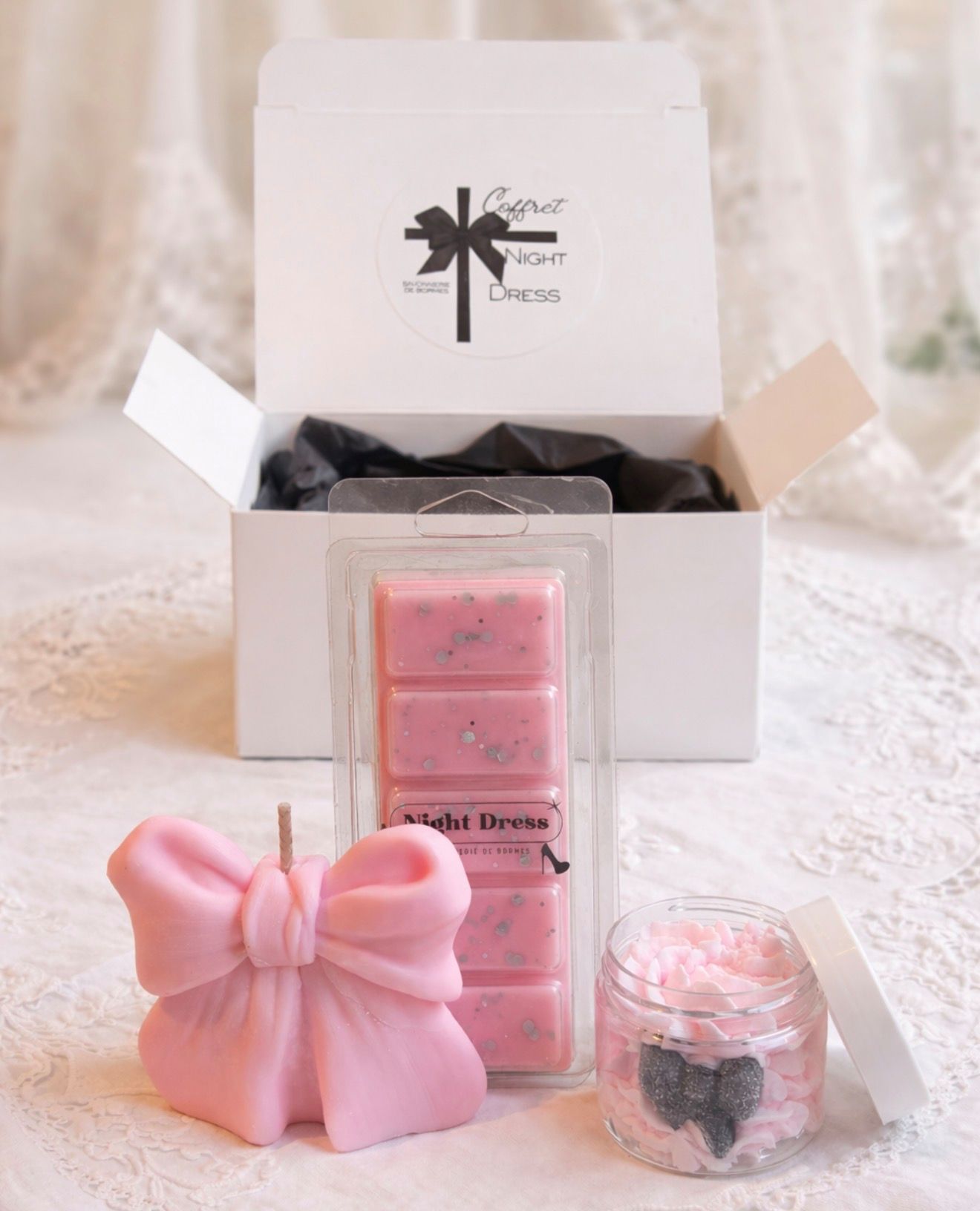 Contient 1 bougie noeud, 1 barre fondante de cire, 1 petite chantilly de douche tout cela dans un parfum très très féminin.