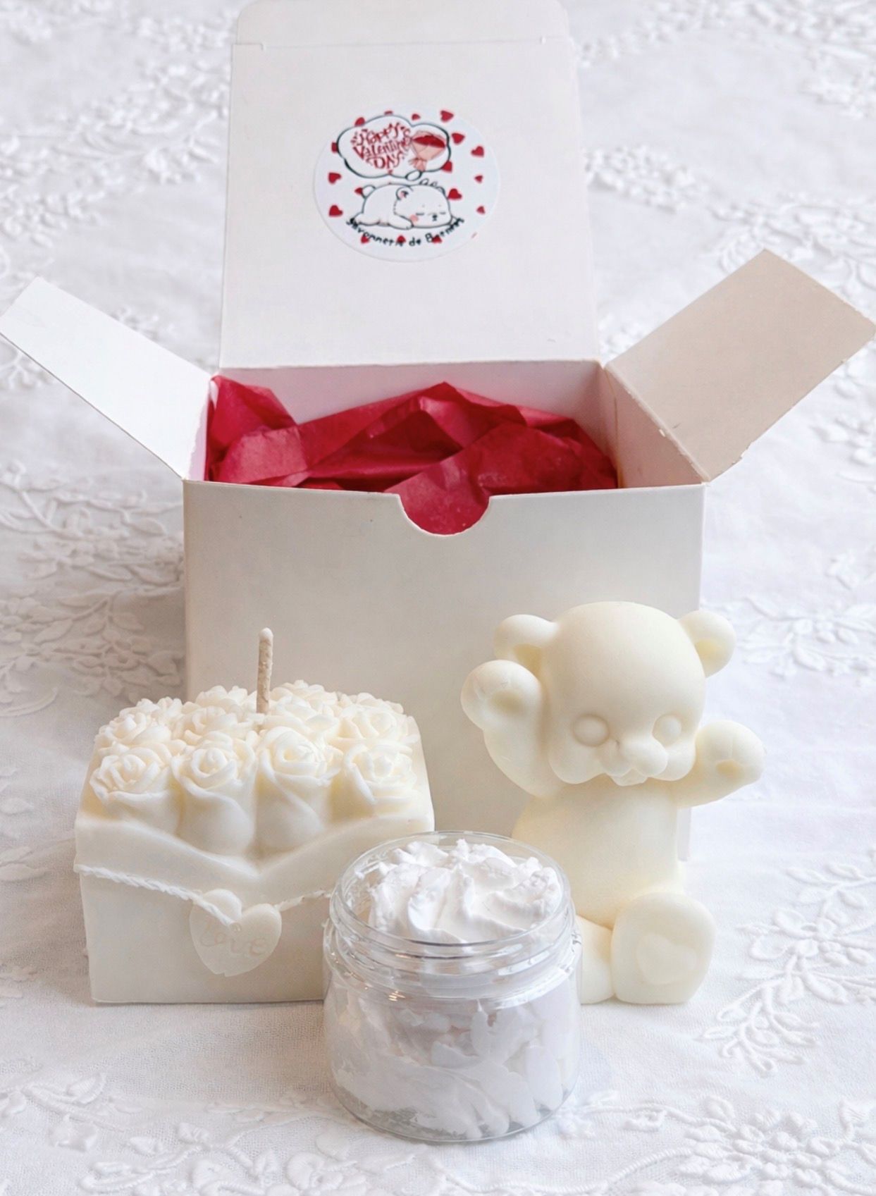 Contient un fondant de cire ours, une petit bougie bouquet de fleurs, une petit chantilly de douche.